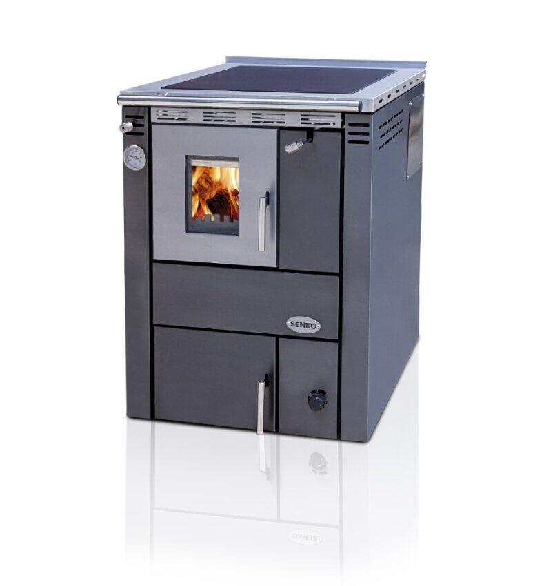 Caldeira com funcionamento a lenha para ligar ao aquecimento central e águas quentes sanitárias, pode ser instalada na cozinha ou outra divisão, placa para aquecer, permite cozinhar.