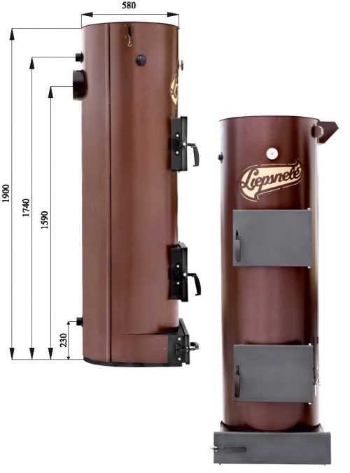 Caldeiras a combustível sólido LIEPSNELE.  Estas caldeiras têm um longo tempo de queima – até 36 horas. Isso ocorre devido ao design da caldeira, a combustão não ocorre de baixo para cima, como na maioria das caldeiras de combustível sólido, mas de cima para baixo, libertando gradualmente o calor do fluido que circula no corpo da caldeira. O grande tamanho da câmara de combustão permite o carregamento de grandes quantidades de combustível de cada vez. A entrada de ar superior com um mecanismo de controle exclusivo permite regular com precisão o modo de funcionamento da caldeira e mantê-lo automaticamente com base na temperatura da água no sistema de aquecimento.