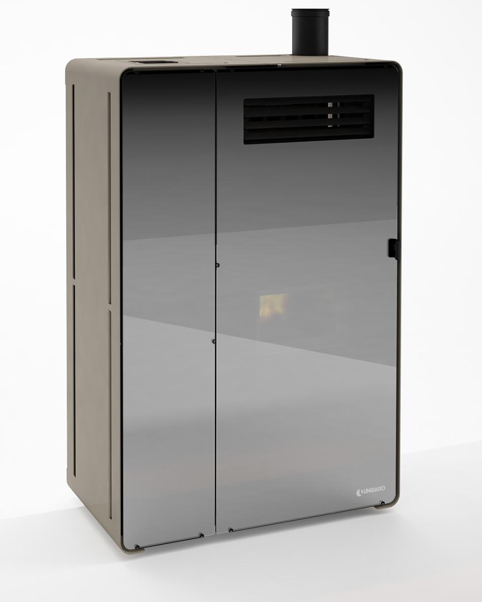 Termostufa a pellets com modulação de combustão automática para o aquecimento doméstico a água. Pode-se ligar a todas as instalações de aquecimento existentes, revestimento disponível em 3 cores, porta revestida a vidro, sistema de limpeza patenteado da faixa de tubos, acendimento e paragem programáveis, produção de água quente sanitária em contínuo (opcional)