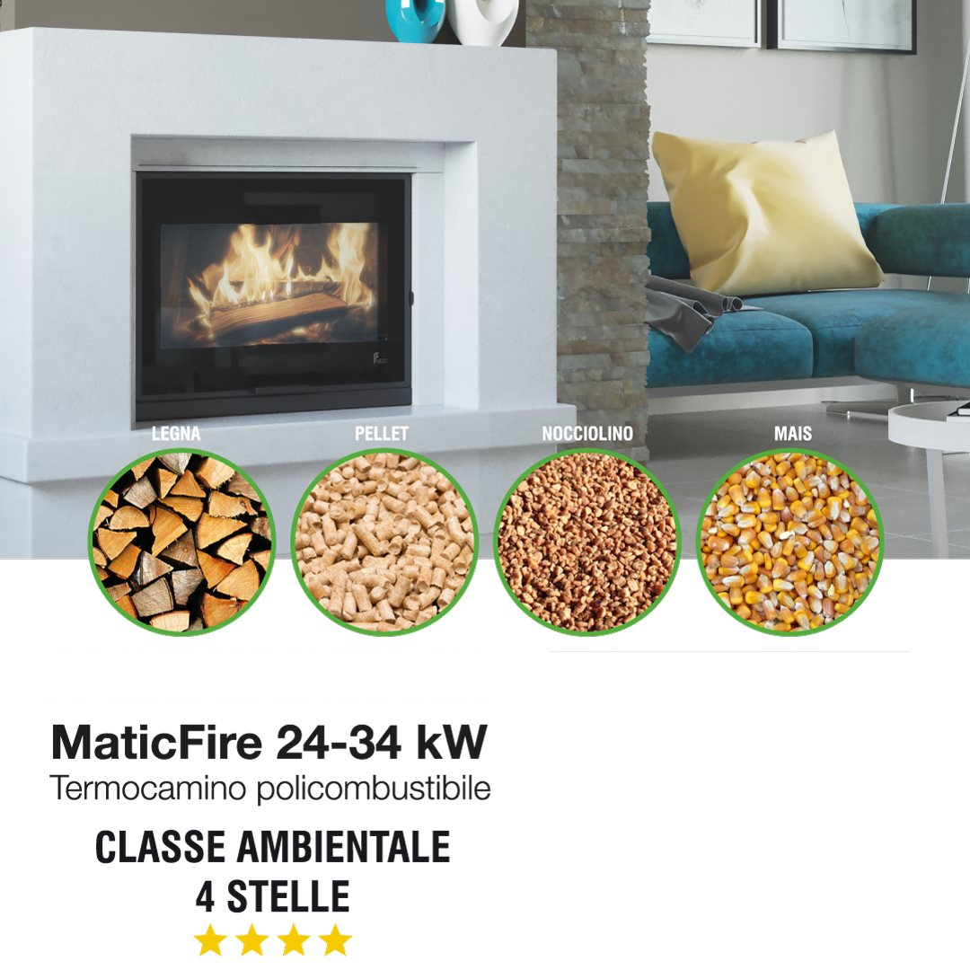 MaticFire Modular,  é um  termo – recuperador multicombustível super compacto, versátil, silencioso, fácil de manusear e limpar, funciona com lenha, pellets, caroço de azeitona, milho e todos os outros combustíveis peletizados e picados, ao mesmo tempo, com uma grande porta em vidro serigrafado.